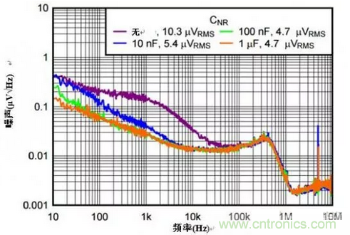 為該引腳添加一個電容器(CNR/SS),就可以形成具有內部電阻的RC濾波器,有助於把由參考電壓生成的無用噪聲分流。由於參考電壓是噪聲的主要來源,增加電容可推送左側低通濾波器的截止頻率。圖 4 顯示了該電容器對輸出噪聲的作用結果。