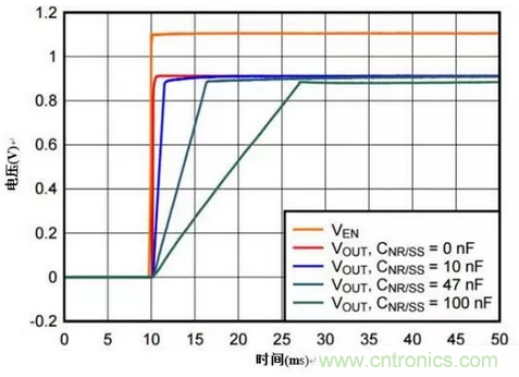 (1)為降低啟動電流,您必須減小輸出電容或降低壓擺率。幸好,CNR/SS 有助實現後者,如圖 5 TPS7A85所示。