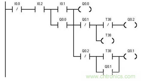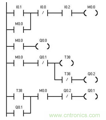 轉換後的梯形圖程序如圖2所(suo)示(shi)。按(an)照(zhao)梯(ti)形(xing)圖(tu)語(yu)言(yan)中(zhong)的(de)語(yu)法(fa)規(gui)定(ding)簡(jian)化(hua)和(he)修(xiu)改(gai)梯(ti)形(xing)圖(tu)。為(wei)了(le)簡(jian)化(hua)電(dian)路(lu),當(dang)多(duo)個(ge)線(xian)圈(quan)都(dou)受(shou)某(mou)一(yi)串(chuan)並(bing)聯(lian)電(dian)路(lu)控(kong)製(zhi)時(shi),可(ke)在(zai)梯(ti)形(xing)圖(tu)中(zhong)設(she)置(zhi)該(gai)電(dian)路(lu)控(kong)製(zhi)的(de)存(cun)儲(chu)器(qi)的(de)位(wei),如(ru)M0.0。簡化後的程序如圖3-所示。