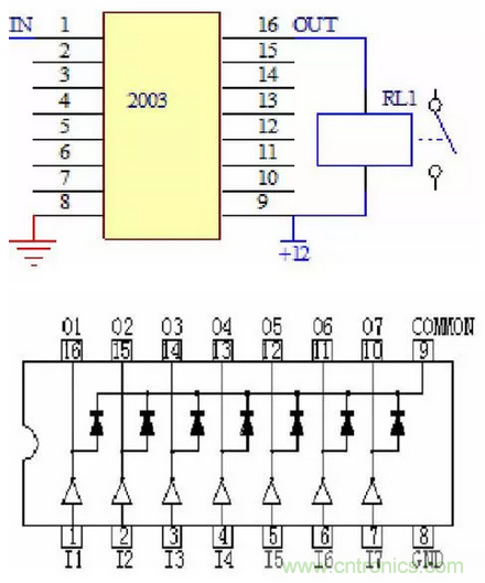 根據集成電路驅動器2003的輸入輸出特性,有人把它簡稱叫“驅動器”“反向器”“放大器”等,現在常用型號為:TD62003AP。當2003輸入端為高電平時,對應的輸出口輸出低電平,繼電器線圈通電,繼電器觸點吸合;當2003輸入端為低電平時,繼電器線圈斷電,繼電器觸點斷開;在2003內部已集成起反向續流作用的二極管,因此可直接用它驅動繼電器。