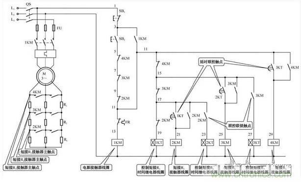 轉子回路中的3組啟動電阻,由接觸器2KM、3KM、4KM在時間繼電器1KT、2KT、KT3的控製下被順序短接;在正常工作時,隻有接觸器1KM和2KM的主觸點閉合。
