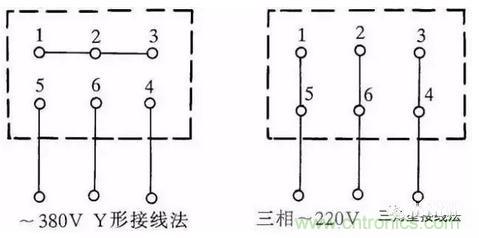 一般常用三相交流電動機接線架上都引出6個接線柱,當電動機銘牌上標為Y形接法時,D6、D4、D5相連接,D1~D3接電源;為△形接法時,D6與D1連接,D4與D2連接,D5與D3連接,然後D1~D3接電源。可參見圖1所示連接方法連接。