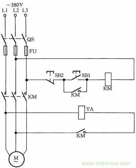 采cai用yong交jiao流liu電dian磁ci鐵tie製zhi動dong的de三san相xiang異yi步bu電dian動dong機ji有you時shi會hui因yin製zhi動dong電dian磁ci鐵tie延yan時shi釋shi放fang,造zao成cheng製zhi動dong失shi靈ling。造zao成cheng電dian磁ci鐵tie延yan時shi釋shi放fang的de原yuan因yin是shi接jie觸chu器qi的de主zhu回hui路lu電dian源yuan雖sui被bei切qie斷duan,但dan電dian動dong機ji由you於yu剩sheng磁ci存cun在zai,定ding子zi繞rao組zu產chan生sheng感gan應ying電dian動dong勢shi加jia在zai交jiao流liu電dian磁ci鐵tie上shang,使shi電dian磁ci鐵tie不bu會hui立li即ji釋shi放fang。解jie決jue方fang法fa很hen簡jian單dan,隻zhi要yao在zai交jiao流liu電dian磁ci鐵tie線xian圈quan上shang串chuan入ru一yi個ge交jiao流liu接jie觸chu器qi常chang開kai觸chu點dian,使shi得de斷duan開kai電dian動dong機ji電dian源yuan的de同tong時shi斷duan開kai電dian磁ci鐵tie與yu電dian動dong機ji繞rao組zu線xian圈quan,即ji可ke使shi電dian磁ci鐵tie立li即ji釋shi放fang。線xian路lu參can見jian圖tu10。