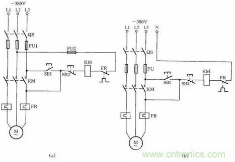 接觸器線圈電壓為380V時,可按圖12(a)所示接線;接觸器線圈電壓為220V時,可按圖12(b)接線。圖12(a)的de接jie線xian還hai有you缺que陷xian,即ji在zai電dian動dong機ji停ting轉zhuan時shi,其qi引yin出chu線xian及ji電dian動dong機ji帶dai電dian,使shi維wei修xiu不bu大da安an全quan。因yin此ci,這zhe種zhong線xian路lu隻zhi能neng在zai應ying急ji時shi采cai用yong,並bing在zai維wei修xiu電dian動dong機ji時shi,應ying斷duan開kai控kong製zhi電dian動dong機ji的de總zong電dian源yuan開kai關guanQS,這一點應特別注意。