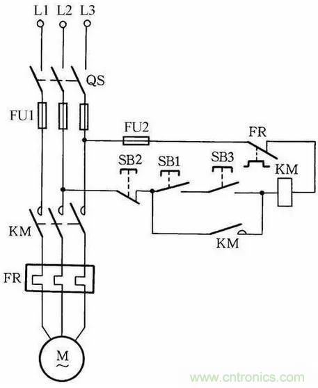圖中SB2為停止按鈕,在停止時,按動SB2的(de)時(shi)間(jian)要(yao)長(chang)一(yi)點(dian)。否(fou)則(ze),手(shou)鬆(song)開(kai)按(an)鈕(niu)後(hou),接(jie)觸(chu)器(qi)又(you)吸(xi)合(he),使(shi)電(dian)動(dong)機(ji)繼(ji)續(xu)運(yun)行(xing)。這(zhe)是(shi)因(yin)為(wei)電(dian)源(yuan)電(dian)壓(ya)雖(sui)被(bei)切(qie)斷(duan),但(dan)由(you)於(yu)慣(guan)性(xing)的(de)作(zuo)用(yong),電(dian)動(dong)機(ji)轉(zhuan)子(zi)仍(reng)然(ran)轉(zhuan)動(dong),其(qi)定(ding)子(zi)繞(rao)組(zu)會(hui)產(chan)生(sheng)感(gan)應(ying)電(dian)動(dong)勢(shi),一(yi)旦(dan)停(ting)止(zhi)按(an)鈕(niu)很(hen)快(kuai)複(fu)位(wei),感(gan)應(ying)電(dian)動(dong)勢(shi)直(zhi)接(jie)加(jia)在(zai)接(jie)觸(chu)器(qi)線(xian)圈(quan)上(shang),使(shi)其(qi)再(zai)次(ci)吸(xi)合(he),電(dian)動(dong)機(ji)繼(ji)續(xu)運(yun)轉(zhuan)。