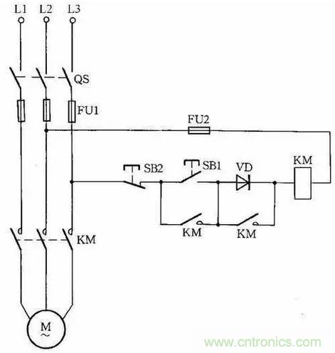 因為啟動電流較大,所以這種線路隻適用於操作不頻繁的場合。線路中,VD應選用耐壓大於700V的二極管,電流要根據交流接觸器線圈電流而定。