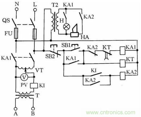 這種絕緣耐壓測試儀可測燈具,將待測燈具與A、B兩接線柱接好,按下按鈕SB1,中間繼電器KA1得電並自鎖;然後將調壓器VT(1∶10,輸出0~250V)調至需測的電壓值,如需調到1500V則將VT調到電壓表指示150V(同理,作2000V耐壓時,調到電壓表指示200V),經時間繼電器KT延時後,電源自動切斷,見圖21。