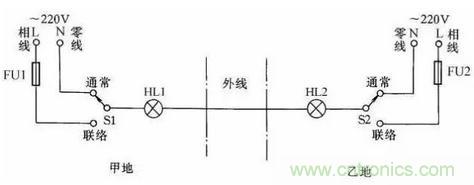 在某些生產過程中,需要兩地的生產人員能傳遞簡單的信息,以協調工作。圖22所(suo)示(shi)是(shi)用(yong)一(yi)根(gen)導(dao)線(xian)傳(chuan)遞(di)聯(lian)絡(luo)信(xin)號(hao)線(xian)路(lu)。兩(liang)地(di)中(zhong)各(ge)有(you)一(yi)隻(zhi)雙(shuang)擲(zhi)開(kai)關(guan)控(kong)製(zhi)信(xin)號(hao)燈(deng)聯(lian)絡(luo),信(xin)號(hao)燈(deng)分(fen)別(bie)裝(zhuang)在(zai)兩(liang)地(di),一(yi)地(di)一(yi)個(ge)。當(dang)甲(jia)地(di)向(xiang)乙(yi)地(di)發(fa)聯(lian)絡(luo)信(xin)號(hao)時(shi),撥(bo)動(dong)開(kai)關(guan)S1,乙地的指示燈亮,待乙地完成甲地所指示的任務後,乙地可把開關撥至“聯絡”位置,通知甲地工作已完成。