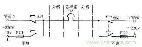 圖23所示線路可使甲乙兩地都能向總控製室發聯絡信號。當甲地向總控製室發信號時,按下按鈕SB1,控製室的電鈴告警。同理當乙地向總控製室發信號時按下SB2即可。甲乙兩地信號可用信號鈴聲的時間長短或次數區分。