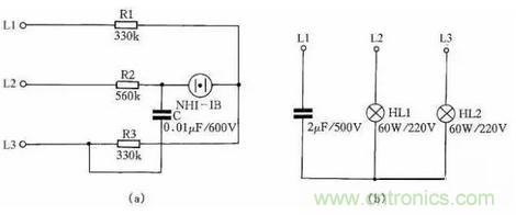 第二種方法是:用一隻2μF、耐壓為500V的電容和兩隻相同功率(220V/60W)的白熾燈泡,便可做成一個交流電源相序指示器,見圖25(b)。