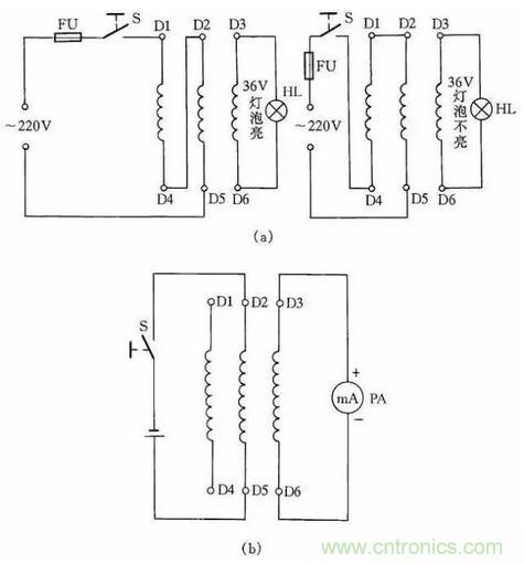 采用此法應注意兩點:一是在接線前必須把行燈變壓器次級一端與殼體的連接線(保護接地線)拆除;二是要注意行燈變壓器的初、次級繞組的電流都不能超過各自的額定電流值。