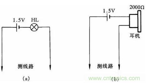 圖27(a)、(b)是最簡便的線路通斷檢測器。當測得導線通路時,燈泡會發光,耳機在通斷瞬時會發響;當線路斷路時,耳機不響,燈泡不亮。這種方法簡單易行,非常適合初學電工製作工具儀表或代替萬用表做測量,其優點是攜帶方便。