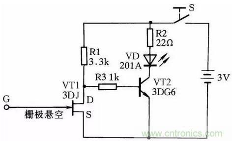 圖28所示是一感應測電筆線路。它可方便地測出導線的斷芯位置。在用來測導線斷芯位置時,在導線一端接上220V的(de)電(dian)源(yuan)相(xiang)線(xian),然(ran)後(hou)用(yong)感(gan)應(ying)測(ce)電(dian)筆(bi)的(de)探(tan)頭(tou)柵(zha)極(ji)靠(kao)近(jin)被(bei)測(ce)導(dao)線(xian),並(bing)沿(yan)線(xian)移(yi)動(dong)。如(ru)果(guo)發(fa)光(guang)二(er)極(ji)管(guan)在(zai)移(yi)動(dong)中(zhong)突(tu)然(ran)熄(xi)滅(mie),那(na)麼(me)此(ci)處(chu)便(bian)是(shi)導(dao)線(xian)斷(duan)芯(xin)位(wei)置(zhi)。