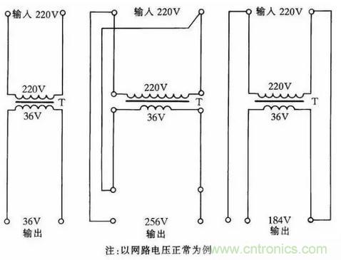 圖中的黑圓點表示繞組的同名端。如果將初、次級的連接線改為同名端相連;則輸出電壓將降低6.3V。采用這種接法;負載電流不得大於初、次級的額定電流。網路電壓如經常比220V低(或高)30~40V;可選220V/36V的變壓器連接。