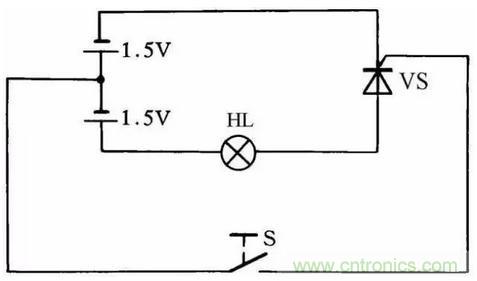 利用圖30所示的簡便方法可檢查晶閘管的好壞。當開關S斷開時燈泡不亮,而當開關S閉合後燈泡發亮,說明晶閘管能導通工作,否則晶閘管就是壞的。此方法對一般晶閘管均能測試,燈泡選用1.5V小電珠燈泡。