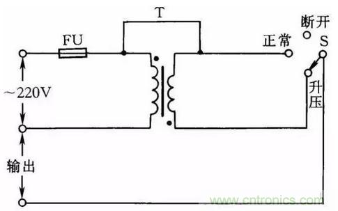 有些地區的電壓常低於220V;而有些地區的電壓則高於220V;那麼用現有的雙繞組變壓器接成自耦變壓器來升高或降低電源電壓;即能使額定電壓為220V的用電器正常工作;如圖33所示。當開關S打在“升壓”位置時;變壓器相當於一個自耦變壓器;將電源電壓升高6.3V;如將開關S打在“正常”位置時;負載是直接接到電源上;輸出電壓仍為電源電壓。