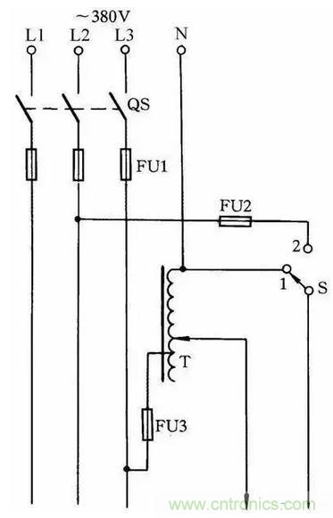 一般的單相自耦調壓器調壓範圍是0~250V。但有時需要高於250V的可調電壓,那麼按圖34接線,可以得到0~406V連續可調的輸出電壓。當S打在“1”擋位置時,輸出電壓為0~250V;將S打在“2”擋位置時,輸出電壓為220~406V。