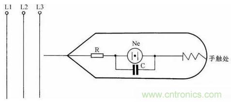 為了快速、準確地判斷,可在一般的低壓驗電筆的氖泡上並聯一隻1500pF小(xiao)電(dian)容(rong),這(zhe)樣(yang)在(zai)測(ce)強(qiang)電(dian)時(shi),電(dian)筆(bi)照(zhao)常(chang)發(fa)光(guang)。而(er)測(ce)得(de)的(de)是(shi)感(gan)應(ying)電(dian)時(shi),感(gan)應(ying)電(dian)會(hui)通(tong)過(guo)電(dian)容(rong)再(zai)經(jing)過(guo)人(ren)體(ti)被(bei)大(da)地(di)吸(xi)收(shou)掉(diao),所(suo)以(yi)電(dian)筆(bi)不(bu)發(fa)光(guang)。在(zai)自(zi)製(zhi)這(zhe)種(zhong)驗(yan)電(dian)筆(bi)時(shi)應(ying)把(ba)電(dian)筆(bi)上(shang)串(chuan)聯(lian)的(de)保(bao)護(hu)電(dian)阻(zu)放(fang)在(zai)測(ce)電(dian)筆(bi)線(xian)路(lu)的(de)最(zui)前(qian)端(duan)以(yi)保(bao)障(zhang)安(an)全(quan),見(jian)圖(tu)36。