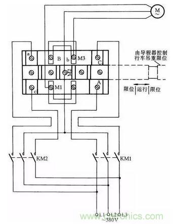 這(zhe)裏(li)介(jie)紹(shao)一(yi)種(zhong)常(chang)用(yong)限(xian)位(wei)器(qi)接(jie)線(xian)方(fang)法(fa),這(zhe)種(zhong)限(xian)位(wei)器(qi)主(zhu)要(yao)用(yong)於(yu)行(xing)車(che)的(de)上(shang)下(xia)電(dian)動(dong)機(ji)限(xian)位(wei)。當(dang)吊(diao)鉤(gou)高(gao)於(yu)限(xian)製(zhi)位(wei)置(zhi)時(shi),它(ta)會(hui)使(shi)電(dian)動(dong)機(ji)自(zi)動(dong)斷(duan)開(kai)電(dian)源(yuan)。這(zhe)種(zhong)方(fang)法(fa)一(yi)般(ban)是(shi)斷(duan)開(kai)主(zhu)電(dian)機(ji)電(dian)源(yuan)線(xian),而(er)不(bu)是(shi)用(yong)控(kong)製(zhi)線(xian)控(kong)製(zhi)接(jie)觸(chu)器(qi)通(tong)斷(duan)電(dian)動(dong)機(ji)停(ting)止(zhi)限(xian)位(wei),其(qi)優(you)點(dian)是(shi)萬(wan)一(yi)接(jie)觸(chu)器(qi)觸(chu)點(dian)熔(rong)在(zai)一(yi)起(qi)不(bu)能(neng)斷(duan)開(kai)時(shi),限(xian)位(wei)器(qi)同(tong)樣(yang)能(neng)起(qi)到(dao)保(bao)護(hu)限(xian)位(wei)的(de)作(zuo)用(yong)。其(qi)接(jie)線(xian)方(fang)法(fa)如(ru)圖(tu)38所示。