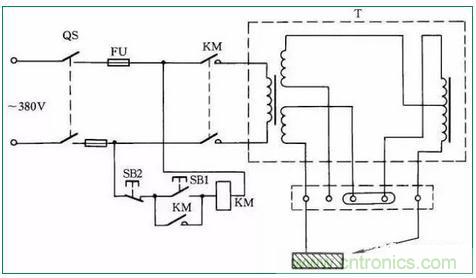 交流電焊機一般接法如圖39所示。當合上刀閘QS時,按下按鈕SB1,接觸器KM得電吸合;鬆開按鈕SB1時,KM自鎖觸點自鎖,電焊機繼續得電工作。當按下SB2時,電焊機停止工作。