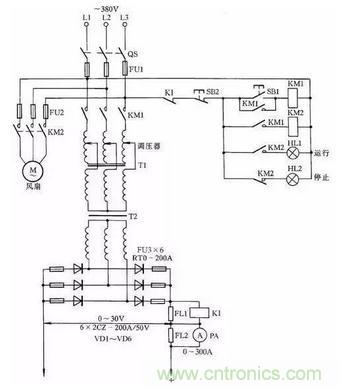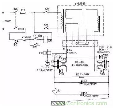 電路中VD1~VD4為4隻矽整流二極管;R1~R4、C1~C4組成矽整流器件的過壓保護電路;FR為過流繼電器,保護矽整流器件。當負載電流超過額定值時,電流互感器次級電流相應增加,帶動繼電器FR動作,FR常閉觸點打開,接觸器KM釋放,觸點打開切斷電焊機電源。矽整流器件用0.25kW風扇作風冷設備。圖中,C5為濾波電容,R5為泄放電阻。