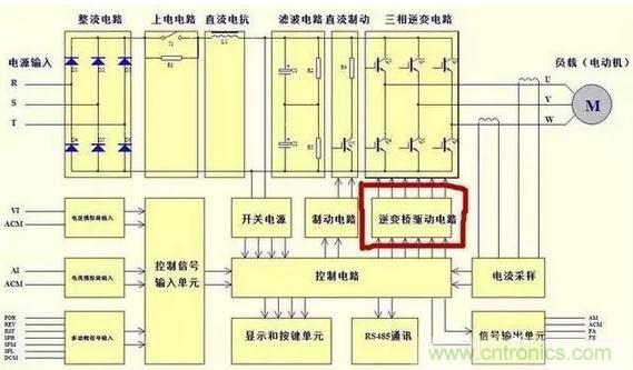 從上圖中,我們可以看出上半部分是主電路結構圖,而下半部分是控製電路,控製電路的功能就是生產逆變電路需要的6路脈衝信號,除此之外,控製電路還負責主電路的電流、電壓檢測、故障檢測、停機保護、操作控製、實施顯示和通訊等任務。