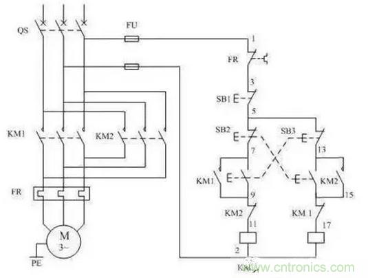 為了使電動機能夠正轉和反轉,可采用兩隻接觸器KM1、KM2換huan接jie電dian動dong機ji三san相xiang電dian源yuan的de相xiang序xu,但dan兩liang個ge接jie觸chu器qi不bu能neng吸xi合he,如ru果guo同tong時shi吸xi合he將jiang造zao成cheng電dian源yuan的de短duan路lu事shi故gu,為wei了le防fang止zhi這zhe種zhong事shi故gu,在zai電dian路lu中zhong應ying采cai取qu可ke靠kao的de互hu鎖suo,上shang圖tu為wei采cai用yong按an鈕niu和he接jie觸chu器qi雙shuang重zhong互hu鎖suo的de電dian動dong機ji正zheng、反兩方向運行的控製電路。