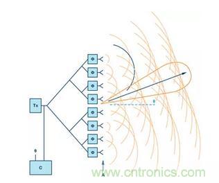 圖1展zhan示shi了le如ru何he通tong過guo調tiao整zheng每mei個ge天tian線xian中zhong信xin號hao的de相xiang位wei,將jiang有you效xiao波bo束shu控kong製zhi在zai線xian性xing陣zhen列lie的de目mu標biao方fang向xiang上shang。結jie果guo,陣zhen列lie中zhong的de每mei個ge天tian線xian都dou具ju有you獨du立li的de相xiang位wei和he幅fu度du設she置zhi,以yi形xing成cheng期qi望wang的de輻fu射she圖tu。由you於yu沒mei有you機ji械xie運yun動dong部bu件jian,所suo以yi很hen容rong易yi理li解jie相xiang控kong陣zhen中zhong波bo束shu快kuai速su轉zhuan向xiang的de屬shu性xing。