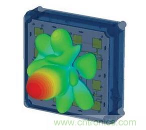 圖3:平板陣列,圖中所示為PCB頂部的天線貼片,IC則位於天線PCB的背麵。