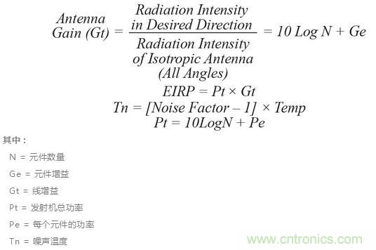在(zai)設(she)計(ji)時(shi)要(yao)考(kao)慮(lv)陣(zhen)列(lie)大(da)小(xiao)與(yu)每(mei)個(ge)輻(fu)射(she)元(yuan)件(jian)的(de)功(gong)率(lv)之(zhi)間(jian)的(de)權(quan)衡(heng)關(guan)係(xi),這(zhe)些(xie)元(yuan)件(jian)會(hui)影(ying)響(xiang)波(bo)束(shu)的(de)方(fang)向(xiang)性(xing)和(he)有(you)效(xiao)輻(fu)射(she)功(gong)率(lv)。可(ke)以(yi)通(tong)過(guo)考(kao)察(cha)一(yi)些(xie)常(chang)見(jian)的(de)品(pin)質(zhi)因(yin)數(shu)來(lai)預(yu)測(ce)天(tian)線(xian)的(de)性(xing)能(neng)。通(tong)常(chang),天(tian)線(xian)設(she)計(ji)人(ren)員(yuan)會(hui)考(kao)察(cha)天(tian)線(xian)增(zeng)益(yi)、有效各向輻射功率 (EIRP) 及Gt/Tn。有一些基礎等式可用於描述以下等式中所示的這些參數。我們可以看到,天線增益和EIRP與陣列中元件的數量成正比。這可能導致地麵雷達應用中常見的大型陣列。