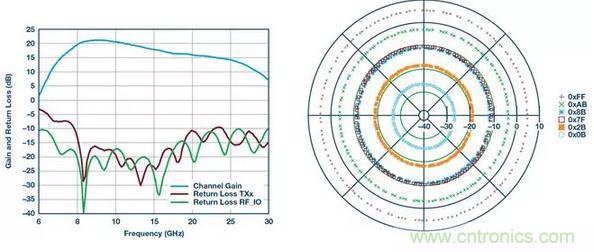 圖5顯示了具有全360°相位覆蓋的增益和相位控製,可以實現小於2.8°的相位步長和優於31 dB的增益控製。ADAR1000集成片上存儲器,可存儲多達121個波束狀態,其中一個狀態包含整個IC的所有相位和增益設置。發射器提供大約19 dB的增益和15 dBm的飽和功率,其中接收增益約為14 dB。另一個關鍵指標是增益控製的相位變化,其在20 dB範圍內約為3°。同樣,在整個360°相位覆蓋範圍內,相位控製的增益變化約為0.25 dB,緩解了校準難題。