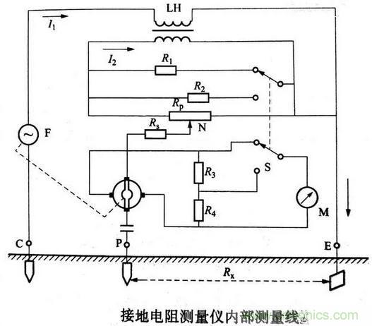 接地電阻測量儀由手搖發電機F、電流互感器LH、倍率開關S、調節電位器Rp及檢流計M等組成,全部機構裝在塑料殼內,外有皮殼便於攜帶,附件有輔助探棒、導線等,其內部測量線路如下圖所示。