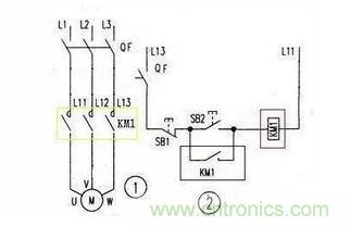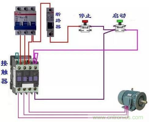 上圖是用接觸器控製電機的原理圖,圖1是主回路,圖2是控製回路,圖中黃色框內就是接觸器的主觸點,藍色框內是接觸器的輔助觸點,紅色框內是接觸器的線圈。SB2是起動按鈕,SB1是停止按鈕,當按下SB2時KM1線圈得電吸合,同時藍色框內的KM1輔助觸點也閉合,鬆開SB2電機照常轉動,按下SB1時電機停止。下圖時交流接觸器接線圖,可以與上圖對照一下。