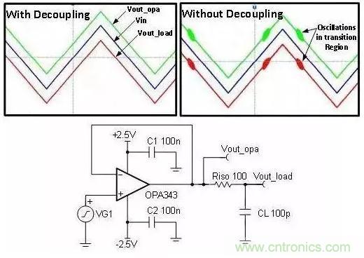 要回答這個問題,需要考證在不使用去耦器件時會出現什麼問題。 圖 1 為帶去耦電容器和不帶去耦電容器(C1 和C2)情況下用於驅動 R-C 負載的緩衝電路。我們注意到,在不使用去耦電容器的情況下,電路的輸出信號包含高頻 (3.8MHz) 振蕩。對於沒有去耦電容器的放大器而言,通常會出現穩定性低、瞬態響應差、啟動出現故障以及其它多種異常問題。