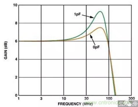 在高速電路中,很小的值就會影響電路的性能。有時候電容值幾十個pF的電容就足夠了。相關實例:如果在反相輸入端僅有1pF的附加寄生電容,它在頻率域可以引起差不多2dB的尖脈衝,如(圖四)。如果寄生電容足夠大的話,它會引起電路的不穩定和震盪。