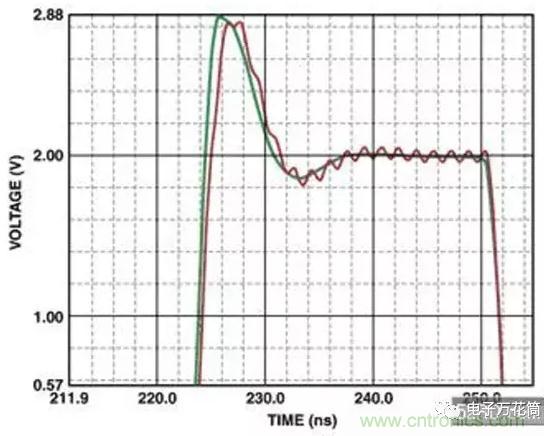 (圖七)中的震盪顯示高速運算放大器同相輸入端長度為2.54cm的印製線的影響。其等效寄生電感為29nH(10-9H),足以造成持續的低壓振蕩,會持續到整個瞬態回應周期。圖七還顯示了如何利用接地平麵來減小寄生電感的影響。