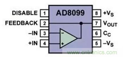 採用低失真引腳排列的一些運算放大器,有助於消除上麵提及的兩個問題;而且它還提高了其他兩個重要方麵的性能。LFCSP的低失真引腳排列,如(圖十)所示,將傳統運算放大器的引腳排列按著逆時針方向移動一個引腳,並且增加了一個輸出引腳作為專用的反饋引腳。