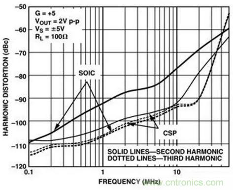 這(zhe)種(zhong)引(yin)腳(jiao)排(pai)列(lie)還(hai)有(you)一(yi)個(ge)好(hao)處(chu)就(jiu)是(shi)降(jiang)低(di)了(le)二(er)次(ci)諧(xie)波(bo)失(shi)真(zhen)。傳(chuan)統(tong)運(yun)算(suan)放(fang)大(da)器(qi)的(de)引(yin)腳(jiao)配(pei)置(zhi)中(zhong)引(yin)起(qi)二(er)次(ci)諧(xie)波(bo)失(shi)真(zhen)的(de)一(yi)個(ge)原(yuan)因(yin)是(shi)同(tong)相(xiang)輸(shu)入(ru)和(he)負(fu)電(dian)源(yuan)引(yin)腳(jiao)之(zhi)間(jian)的(de)耦(ou)合(he)作(zuo)用(yong)。LFCSP封裝的低失真引腳排列消除了這種耦合所以大大地降低了二次諧波失真;在有些情況下最多可降低14dB。(圖十二)顯示了採用SOIC封裝和LFCSP封裝失真性能的差別。