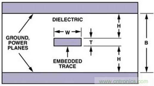 帶狀控製阻抗印製線(圖十四)採用了兩層接地平麵,信號印製線夾在其中。這種方法使用了較多的印製線,需要的PCB層數更多,對電介質厚度變化敏感,而且成本更高,所以通常隻用於要求嚴格的應用中。