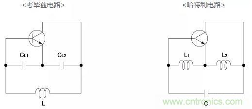 CERALOCK®、石英晶體、LC電路屬於上述第一類電路。考畢茲和哈特利電路是典型的LC正反饋電路和調諧反鍵振蕩電路,如下所示: