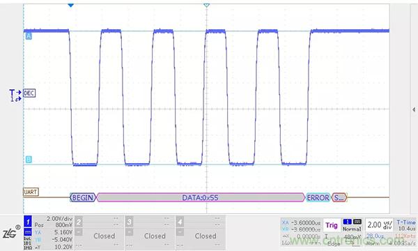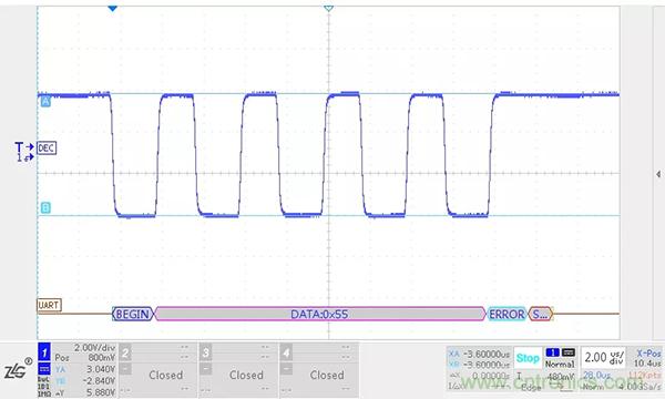 在顯性狀態期間,總線的寄生電容會被充電,而在恢複到隱性狀態時,這些電容需要放電。如果CANH、CANL之間沒有放置任何阻性負載,電容隻能通過收發器內部的差分電阻放電。我們在收發器的CANH、CANL之間加入一個220PF的電容進行模擬試驗,位速率為500kbit/s,波形如下圖所示。
