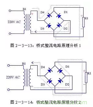 由圖2-3-13可以看出在電源正半周時,B1次級上端為正,下端為負,整流二極管D4和D2導通,電流由變壓器B1次級上端經過D4、R1、D2回到變壓器B1次級下端;由圖2-3-14可以看出在電源負半周時,B1次級下端為正,上端為負,整流二極管D1和D3導通,電流由變壓器B1次級下端經過 D1、R1、D3回到變壓器B1次級上端。R1兩端的電壓始終是上正下負,其波形與全波整流時一致。