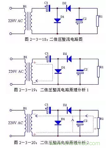 前qian麵mian介jie紹shao的de三san種zhong整zheng流liu電dian路lu輸shu出chu電dian壓ya都dou小xiao於yu輸shu入ru交jiao流liu電dian壓ya的de有you效xiao值zhi,如ru果guo需xu要yao輸shu出chu電dian壓ya大da於yu輸shu入ru交jiao流liu電dian壓ya有you效xiao值zhi時shi可ke以yi采cai用yong倍bei壓ya電dian路lu,見jian圖tu2-3-18。由圖 2-3-19可知,在電源的正半周,變壓器B1次級上端為正下端為負,D1導通,D2截止,C1通過D1充電,充電後C1兩端電壓接近B1次級電壓峰值,方向為左端正右端負;由圖2-3-20可知,在電源的負半周,變壓器B1次級上端為負下端為正,D1截止,D2導通,C2通過D1充電,充電後C2兩端電壓接近C1兩端電壓與B1次級電壓峰值之和,方向為下端正上端負。由於負載R1與C1並聯,當R1足夠大時,R1兩端的電壓即為接近2倍B1次級電壓。