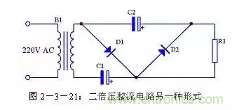 二倍壓整流電路還有另外一種形式的畫法,見圖2-3-21,其原理與圖2-3-18完全一致,隻是表現形式不一樣。