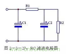 使用兩個電容和一個電阻組成RC濾波電路,又稱π型RC濾波電路。見圖2-3-27所示。這種濾波電路由於增加了一個電阻R1,使交流紋波都分擔在R1上。R1和C2越大濾波效果越好,但R1過大又會造成壓降過大,減小了輸出電壓。一般R1應遠小於R2。