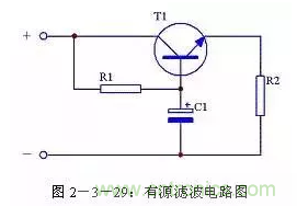 當dang對dui濾lv波bo效xiao果guo要yao求qiu較jiao高gao時shi,可ke以yi通tong過guo增zeng加jia濾lv波bo電dian容rong的de容rong量liang來lai提ti高gao濾lv波bo效xiao果guo。但dan是shi受shou電dian容rong體ti積ji限xian製zhi,又you不bu可ke能neng無wu限xian製zhi增zeng大da濾lv波bo電dian容rong的de容rong量liang,這zhe時shi可ke以yi使shi用yong有you源yuan濾lv波bo電dian路lu。其qi電dian路lu形xing式shi見jian圖tu2-3-29,其中電阻R1是三極管T1的基極偏流電阻,電容C1是三極管T1的基極濾波電容,電阻R2是負載。這個電路實際上是通過三極管T1的放大作用,將C1的容量放大β倍,即相當於接入一個(β+1)C1的電容進行濾波。