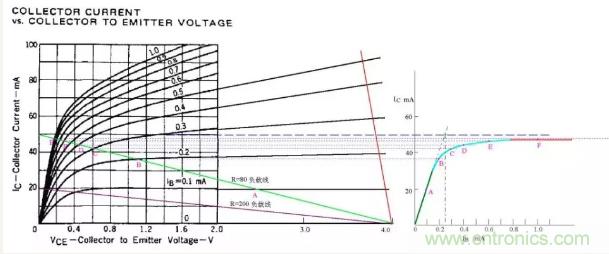 圖中假定電源電壓為4V,綠色的斜線是負載電阻為80歐姆的負載線,V/R=50MA,圖中標出了Ib分別等於0.1、0.2、0.3、0.4、0.6、1.0mA的工作點A、B、C、D、E、F。據此在右側作出了Ic與Ib的關係曲線。根據這個曲線,就比較清楚地看出“飽和”的含義了。曲線的綠色段是線性放大區,Ic隨Ib的增大幾乎成線性地快速上升,可以看出β值約為200。蘭色段開始變彎曲,斜率逐漸變小。紅色段就幾乎變成水平了,這就是“飽和”。實際上,飽和是一個漸變的過程,蘭色段也可以認為是初始進入飽和的區段。在實際工作中,常用Ib*β=V/R作為判斷臨界飽和的條件。在圖中就是假想綠色段繼續向上延伸,與Ic=50MA的水平線相交,交點對應的Ib值就是臨界飽和的Ib值。圖中可見該值約為0.25mA。