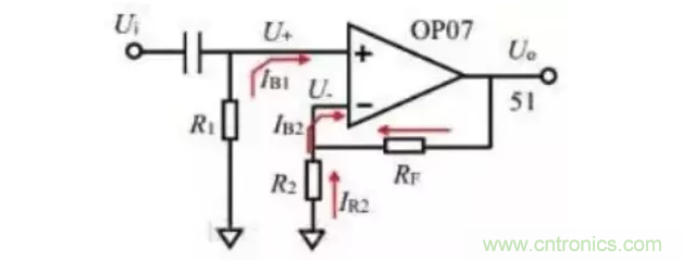 如果 IB1=IB2,那麼選擇 R1=R2//RF,可以使電流形成的失調電壓會消失。但實際中IB1=IB2很難滿足