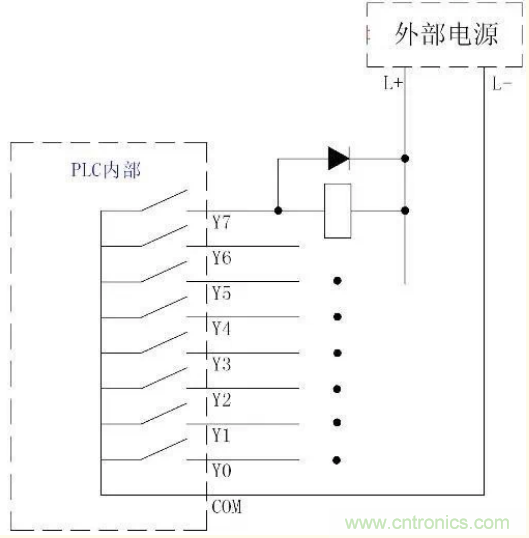 和繼電器輸出形式電路一樣,在驅動感性負載時也要在負載兩端反向並聯二極管(二極管的陰極接電源的正極)防止過電壓,保護PLC的輸出電路。