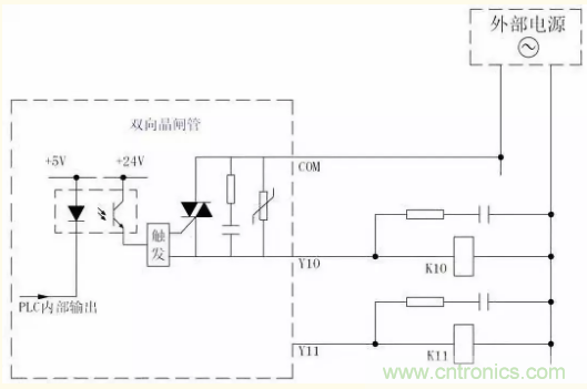 雙向晶閘管輸出的驅動能力要比繼電器輸出的要小,允許負載電壓一般為AC85~242V;單點輸出電流為0.2A~0.5A,當多點共用公共端時,每點的輸出電流應減小(如單點驅動能力為0.3A的雙向晶閘管輸出,在4點共用公共端時,最大允許輸出為0.8A/4點)。